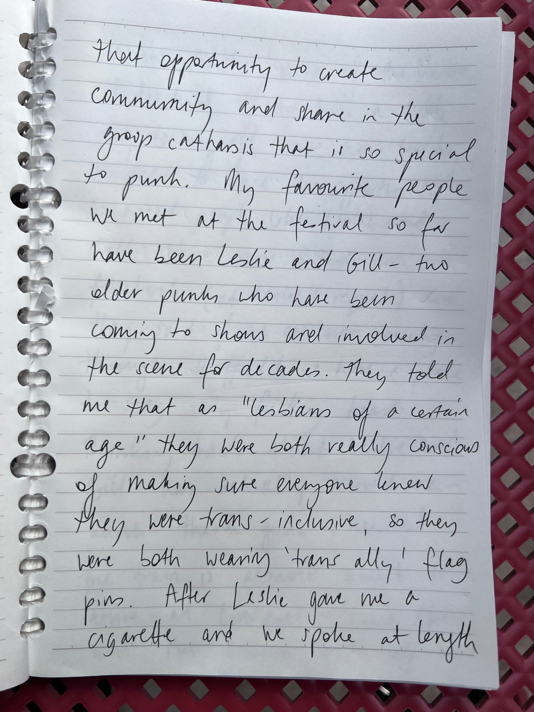 My favourite people we met at the festival so far have been Leslie and Gill; two older punks who have been coming to shows and involved in the scene for decades. They told me that as "lesbians of a certain age" they were both really conscious of making sure everyone knew they were trans-inclusive, so they were both wearing 'trans ally' flag pins.