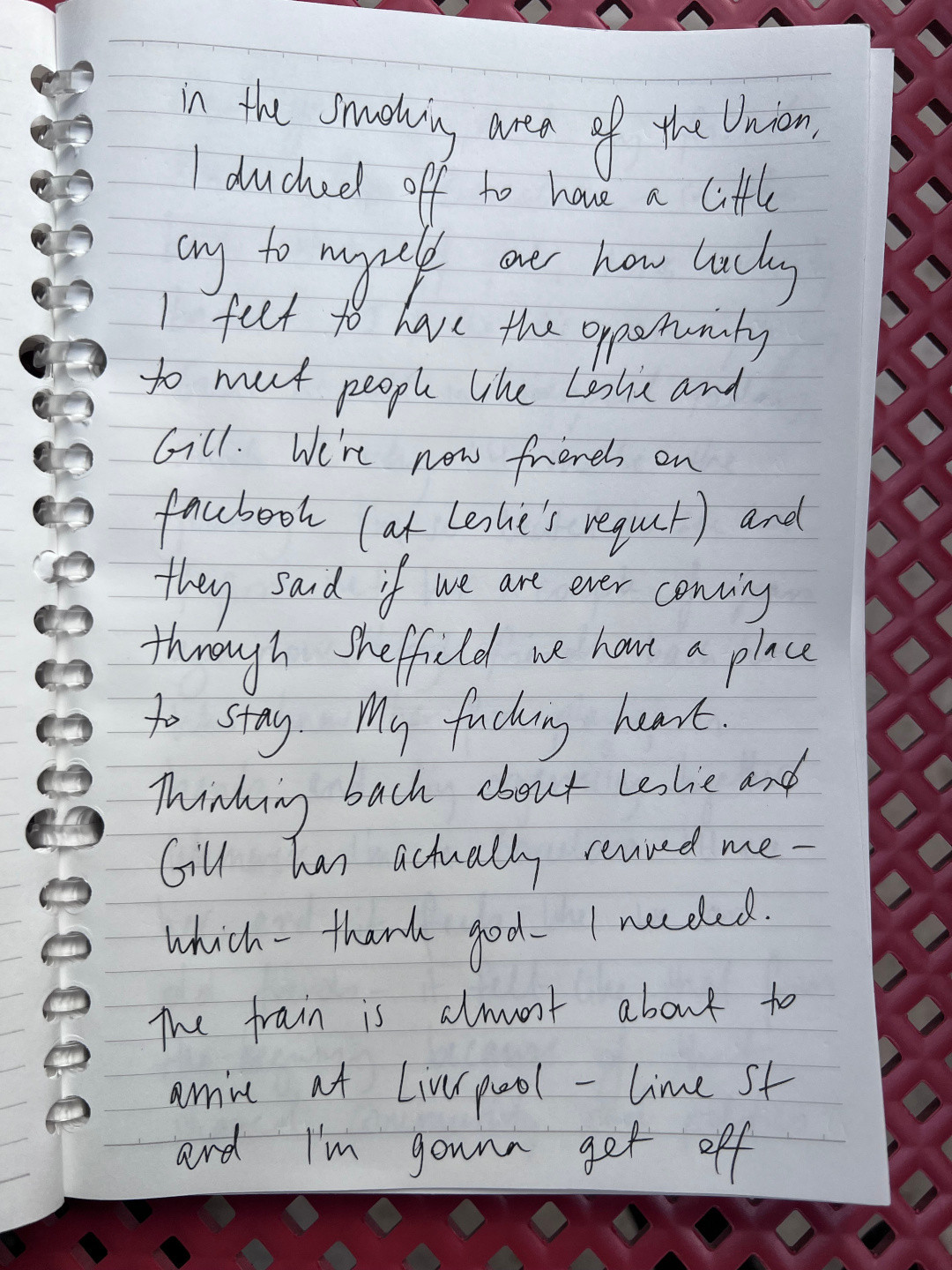 After Leslie gave me a cigarette and we spoke at length in the smoking area of the Union, I ducked off to have a little cry to myself over how lucky I felt to have the opportunity to meet people like Leslie and Gill. We're now friends on facebook (at Leslie's request) and they said if we are ever coming through Sheffield we have a place to stay. My fucking heart.