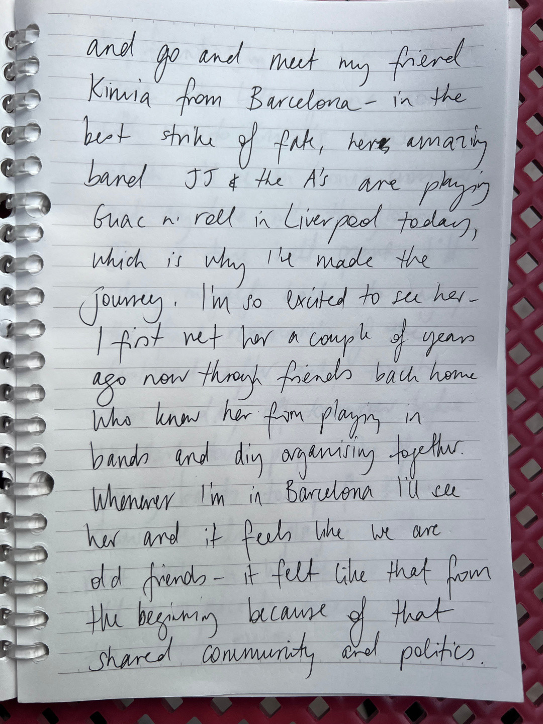 I'm so excited to see her; I first met her a couple of years ago now through friends back home who knew her from playing in bands and DIY organising together. Whenever I'm in Barcelona I'll see her and it feels like we are old friends - it felt like that from the beginning because of that shared community and politics.
