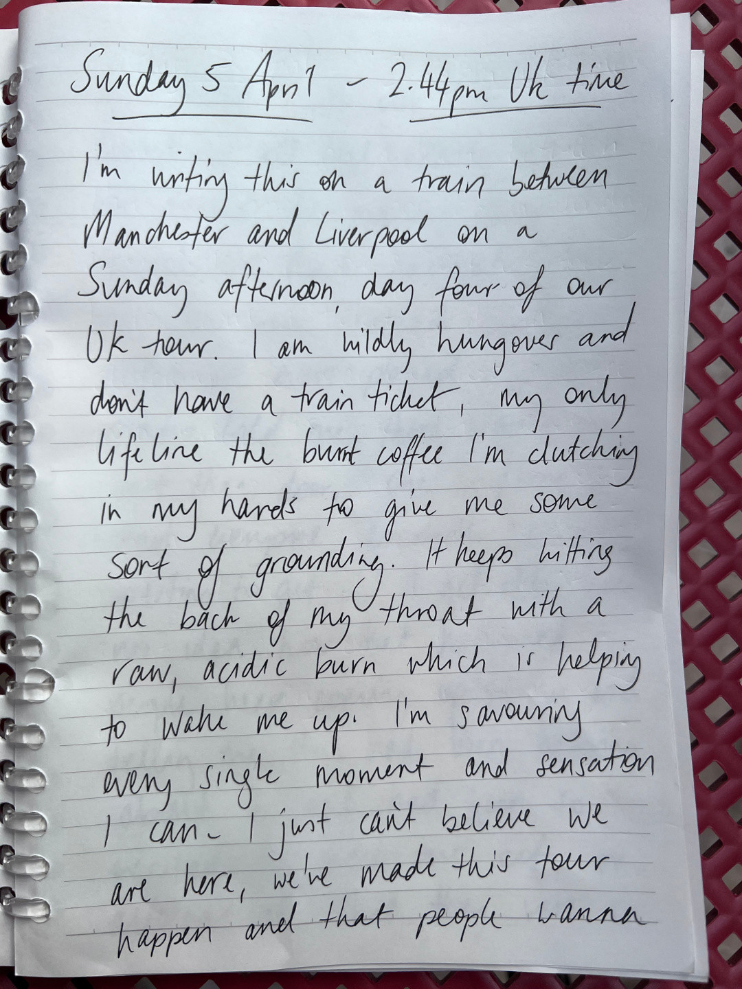I'm writing this on a train between Manchester and Liverpool on a Sunday afternoon, day four of our UK tour. I am mildly hungover and don't have a train ticket, my only lifeline the burnt coffee I'm clutching in my hands to give me some sort of grounding. It keeps hitting the back of my throat with a raw, acidic burn which is helping to wake me up.